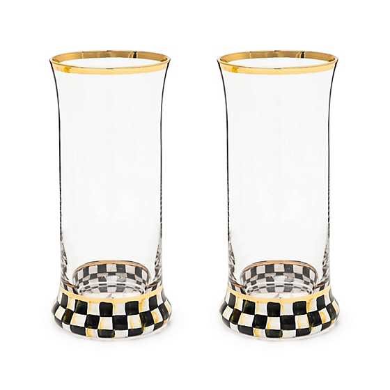 Make any occasion more special by setting the table with our set of two hand-painted Courtly Check® Highball Glasses. These mouth-blown glasses, featuring a base of Courtly Check, are trimmed with gold lustre.