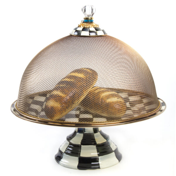 Dining outdoors has just become more pleasant. (Be gone, bugs.) Our wire Large Courtly Check® Mesh Dome is banded in bronzed stainless steel, detailed with enamel and brass accents, and crowned with a glass knob. Designed to fit our enamelware serving platters and pedestal platters, and perfect for picnics.